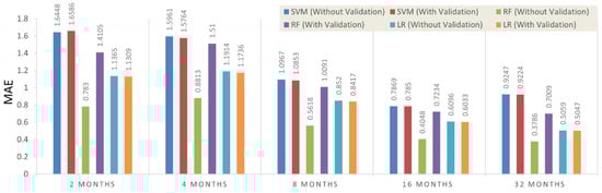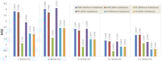 The RF algorithm without cross-validation obtained for thirty-two months can achieve the best performance in MAE results and the RF algorithm without cross-validation obtained for sixteen months can achieve the best performance in MSE results. The results of the LR algorithm, which correctly estimate the negative peak value in Figure 9 for thirty-two months of data, are acceptable and considered to perform well. Moreover, the results show that cross-validation processes in SVM and LR algorithms perform slightly better. The RF algorithm produces slightly worse results. Therefore, it can be concluded that cross-validation is ineffective in this application.