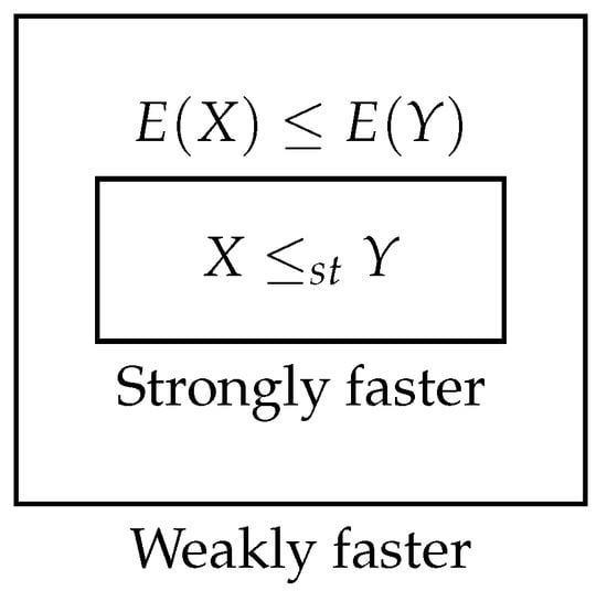 It is trivial that for the case of usual stochastic order, the Definition 4 yields the Definition 3. However, its converse statement is false. As a counterexample, let and Then, but, by Example 1, This yields the Venn diagram shown in Figure 1: