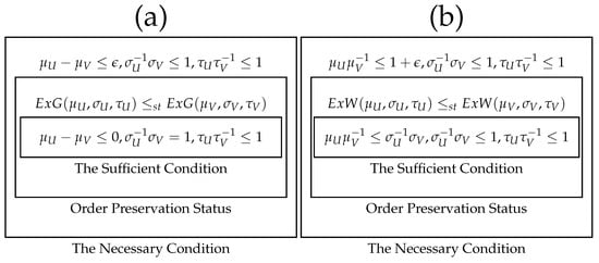The Venn diagram for the association between usual stochastic relationship and the parameters: (a) ExG distribution; (b) ExW distribution.