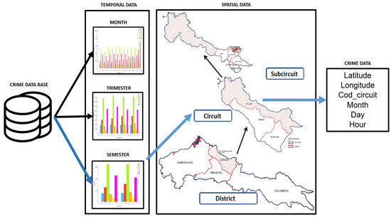 A spatial–temporal data analysis of the criminal database is carried out to identify the most appropriate period (monthly, quarterly, semi-annual, or annual) and the geographic sector (district, circuit, or sub-circuit) where to focus the study. Furthermore, the most relevant characteristics of the database are identified, which will serve as a basis for the development of the crime prediction algorithm and subsequent patrolling (Figure 1).