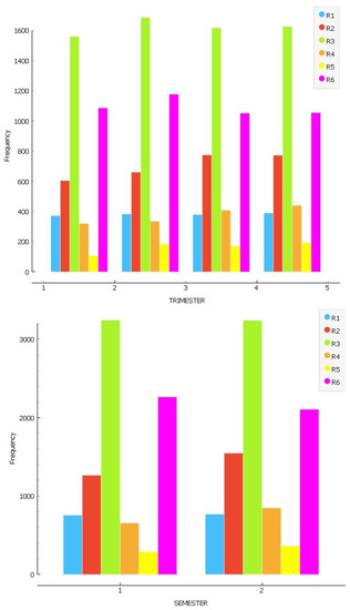 Figure 2 shows the monthly, quarterly, and semi-annual frequency of crimes in 2017 for the different types of crimes (R1–R6). In the monthly distribution, the average per month is 1447 records, with a minimum of 32 records of each crime type. In Figure 2, the quarterly distribution is shown, with an average of 4471 crimes per month and a minimum of 107 records of each type of crime. Finally, in Figure 2, the mean by semester is 8682 records, with a minimum of 292 records by crime type. Based on these data, we have decided that the most appropriate period to identify criminal activity is 6 months. Thus, the necessary number of records is available for each type of crime. The distribution of data between 1, 3, and 6 months maintains the same proportion regarding the number of crimes. Therefore, 6 months was chosen to obtain enough information.