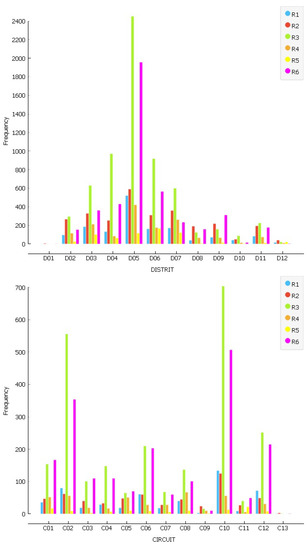 The geographical distribution of crime records in districts, circuits, and sub-circuits in Pichincha Province, Ecuador () is also analyzed. In Figure 3, the frequency of crimes is shown according to crime type by district. Clearly, the district has the highest number of crimes (with a maximum of 6,058). Among the crimes, those of type R3 (40.48%) and R6 (32.30%) stand out. Figure 3 represents the number of crimes according to type per circuit. In this case, circuits and have the highest number of crimes. The most common are again R3 (45.74%) and R6 (32.94%).