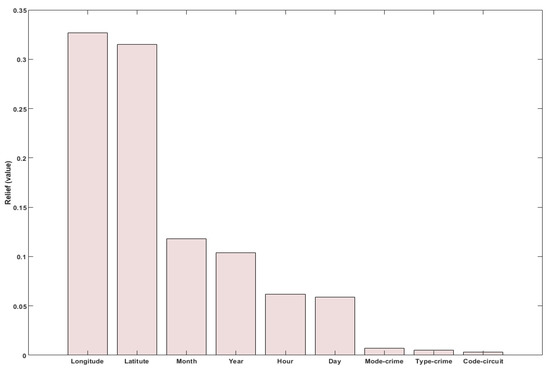According to the results shown in Figure 4, Year and characteristics are not enough relevant to be taken into account. Given that only the data from 2017 will be used and the circuit will be the smallest spatial unit for the study this result is reasonable. On the contray, the most important characteristics seem to be the temporal ones: , , and . The geospatial features, , and , also scored high in the selection. By contrast, crime and mode, which represent the type and manner of carrying out the crime respectively, obtained a medium–low relevance value, so they will not be considered; that is, any type of crime is important for police surveillance.