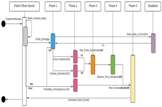 To clarify the algorithm, although the different steps are going to be described in detaile in the next sections, Figure 6 shows the activity UML diagrams. It shows the interaction among the Police Officer Device, the CPSPA algorithm and the database. The sequence of actions carried out to patrol the most conflictive points for each surveillance shift is shown. This diagram has as inputs the circuit that is being patrolled, , and day and time of the patrol. The output is the police patrol route obtained, that consists of a starting point, some way-points along the route, and the final point. This diagram includes all the phases of the CPSPA algorithm.