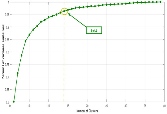 The elbow method is a heuristic procedure that determines an optimal number of clusters in a dataset. This algorithm uses the percentage of variance defined as a function of the number of subgroups (clusters). The first clusters will add much information to the analysis, but the marginal gain will be reduced while more clusters are added. The correct number of groups k is chosen at this point, that will give an angle in the graph of variance vs. number of clusters, i.e., an “elbow” [3,42].