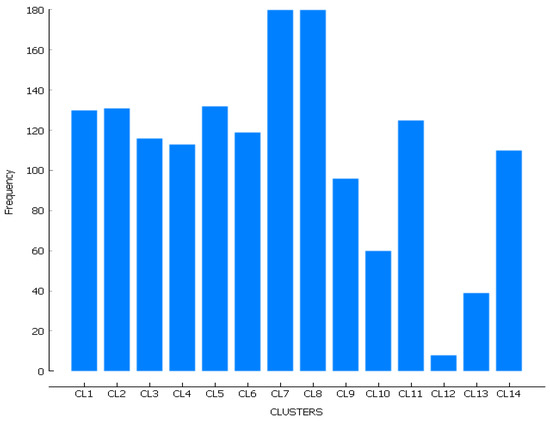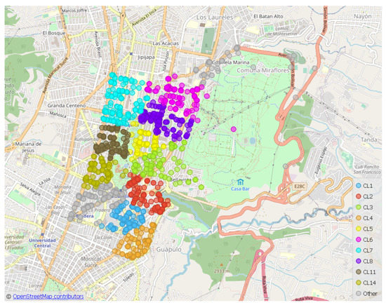 In this phase (see Figure 5), the crimes of a circuit are grouped using the k-means algorithm. As it is an unsupervised clustering, the optimal number of clusters k is obtained with the Elbow method. The objective is to determine the most conflicting areas, (clusters), in circuit , to analyze crimes in more detail. A number of crimes r has been reported in the area that represents each cluster, that is, . As an example: within district the circuit is analyzed, which has 1539 crimes, , reported in 2017. The k-means algorithm is applied with the Elbow method, and the optimal number of clusters is determined, (Figure 8). In Figure 9, the k groups are represented for the circuit in OpenStreetMap.