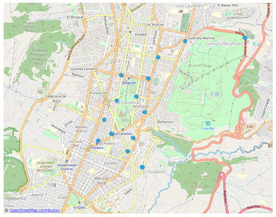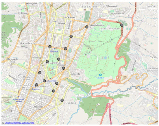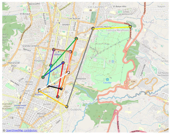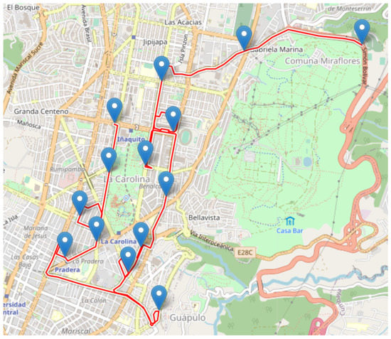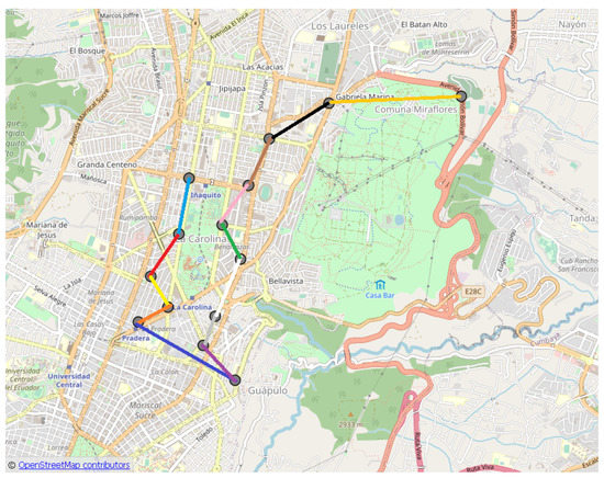 The results of the application of the decision made for the patrol route for a specific case are shown in Figure 14 and Figure 15 and Table 2, where the probabilities (Equation (5)), distances, route time, and time of the patrol between each of the points (blue points Figure 15) are listed. In this specific example, the patrol day is (Saturday), the start time is , and the patrol starting point is . The obtained patrol route is km.