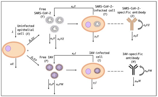 - The model considers the interactions between seven compartments: uninfected epithelial cells (X), SARS-CoV-2-infected cells (Y), IAV-infected cells (I), free SARS-CoV-2 particles (V), free IAV particles (P), SARS-CoV-2-specific antibodies (Z) and IAV-specific antibodies (M). Here, X, Y, I, V, P, Z and M represent the concentrations of the seven compartments.