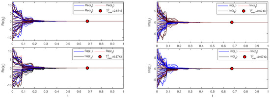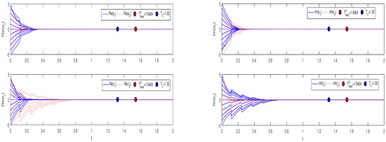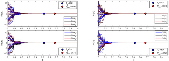 where are defined in system (33). It is not difficult to check that Assumptions 1 and 2 are satisfied with for . In addition, by simple computation, we get , . Choosing and , then the conditions in Theorem 1 are satisfied. Therefore, according to Theorem 1, the master-slave systems (33) and (34) are FXT synchronized within . Figure 5 shows the time changes of the solutions of errors dynamics between (33) and (34) under the controller (7), where the initial values of system (34) are randomly selected in [−8, 8].