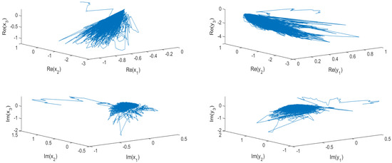 where , and is a real-valued Brown motion. The other parameters of (33) are chosen as . Figure 4 shows the MATLAB simulations of system (33) with initial values , and , , which indicates that system (33) has a chaotic attractors.