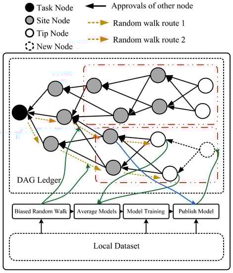- Schmid, R.; Pfitzner, B.; Beilharz, J.; Arnrich, B.; Polze, A. Tangle Ledger for Decentralized Learning. In Proceedings of the 2020 IEEE International Parallel and Distributed Processing Symposium Workshops (IPDPSW), New Orleans, LA, USA, 8–22 May 2020; pp. 852–859. [Google Scholar] [CrossRef]