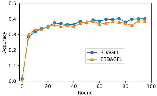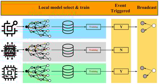 Inspired by above researches, we utilize an event-triggered communication based on the parameter change to solve the optimized objective in Equation (10). The workflow of ESDAGFL is shown in Figure 2. Compared to the baseline, the event-triggered communication mechanism only needs to judge the change of the model’s norm, and does not need to find a reference model. Therefore, ESDAGFL can reduce the energy consumption of the client and the simulation results in Section 5 also demonstrate the advantages of the proposed scheme.