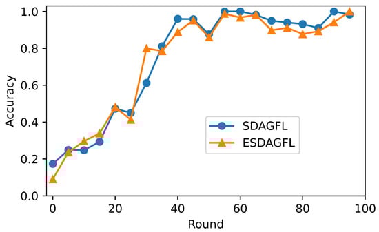 The average training accuracy of ESDAGFL and SDAGFL evaluated on the FMNIST-clustered dataset.
