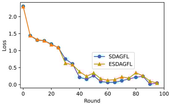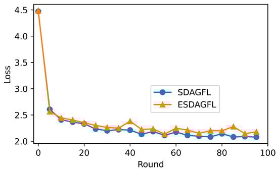 Then, we evaluated the next character prediction task on the Poets dataset to further illustrate the applicability of ESDAGFL for different models. Figure 5 and Figure 6 show ESDAGFL’s average accuracy and loss in the Poets dataset. The experiment results show that ESDAGFL equally applies to the Poets dataset.