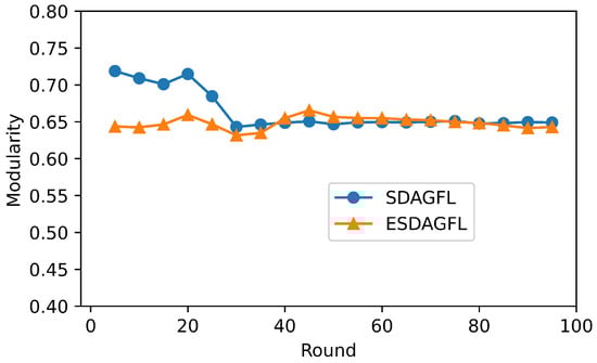 In this part, we evaluated the implicit specialization of the ESDAGFL. There are three metrics to evaluate the implicit specialization of the ESDAGFL. The first is the modularity , which is a metric of the community segmentation in the community discovery algorithm. The more closely connected the nodes within a community and the more sparsely the connections between the communities are, the greater the modularity is. The second metric is the number of modules, which indicates the partitioning of all clients. The number of modules should be an appropriate value. The final metric is approval pureness, which measures the probability that a client approves the nodes published by other clients in the same cluster.