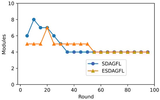 Figure 7 and Figure 8 show the performance of ESDAGFL in the implicit specialization. Figure 7 shows that we achieved similar modularity as the baseline on the FMNIST-clustered dataset. As shown in Figure 8, with the increase of time, we achieve the same number of modules as the baseline and almost all of the clients are clustered into the community relative to their label.