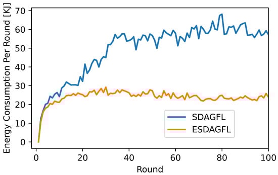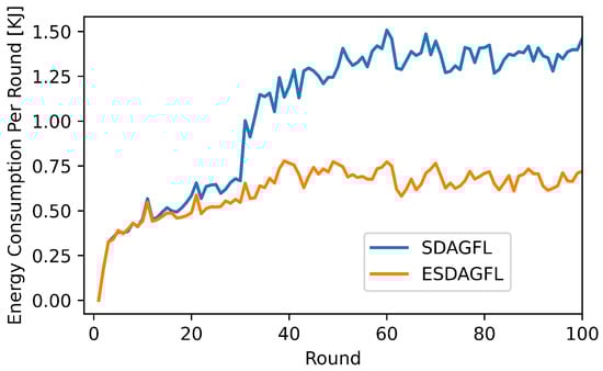 Figure 10 and Figure 11 show the core’s energy consumption per round with 10 clients and when the client performs the random walk from the depth of 15 to 25. The energy consumption of ESDAGFL is lower than the baseline. The total CPU core’s energy consumption of ESDAGFL is 61.29 KJ, and the baseline’s core’s energy consumption is 106.74 KJ. Our ESDAGFL scheme can reduce the 42.5% energy consumption compared with the baseline for the handwriting recognition task. As for the Poets dataset, the total CPU core’s energy consumption of ESDAGFL is 2390.41 KJ, and the baseline’s core’s energy consumption is 4956.63 KJ. Our ESDAGFL scheme can reduce the 51.7% energy consumption for the next character prediction task.