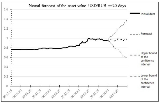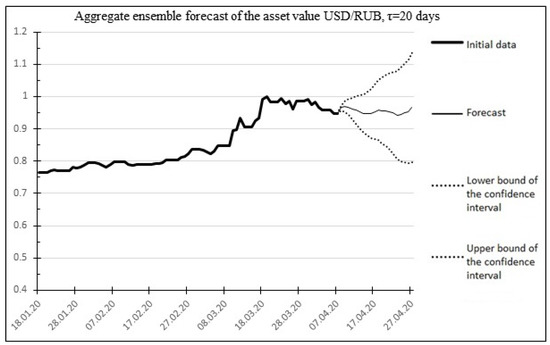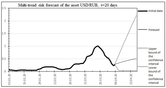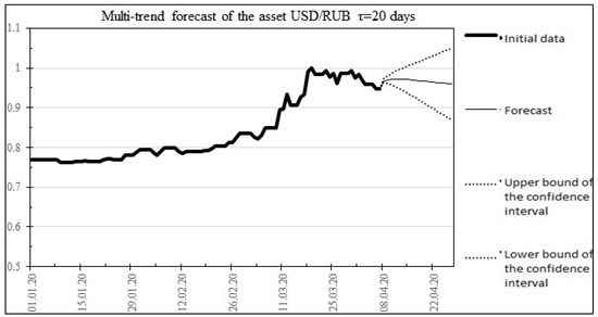 The result of the multitrend forecast for 20 days ahead for the USD/RUB asset.