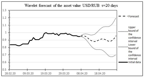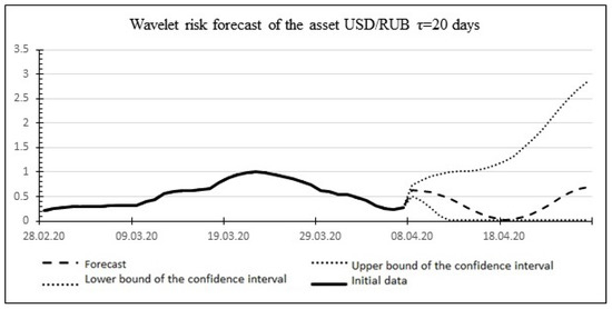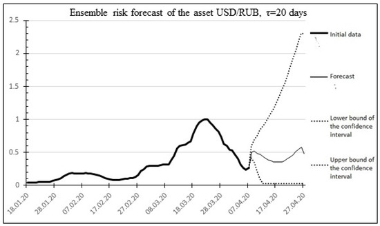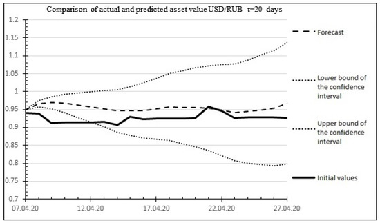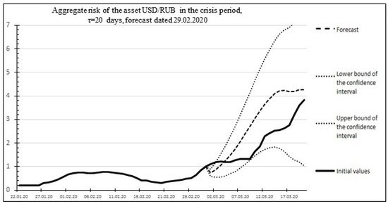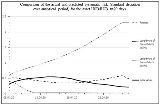 Below, as an example, Figure 14 shows the risk forecast and actual values for the USD/RUB asset for the time of the global economic crisis of 2020, which occurred in the period from 29 February 2020 to 2 April 2020. The historical values of the duration of the crises and the increase in standard deviations obtained based on historical data on the US dollar exchange rate published on the website of the Central Bank of the Russian Federation (Table 5) are used as the initial data for the calculations: