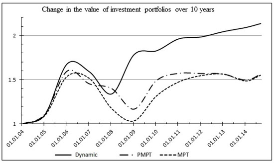 As a result of the experiment, the overall advantage of the dynamic adaptive portfolio was confirmed in comparison with the classical portfolio models of R. Roll and H. Markowitz. The results of modeling (Table 8) and the value change diagram (Figure 15) of investment portfolios are presented below.