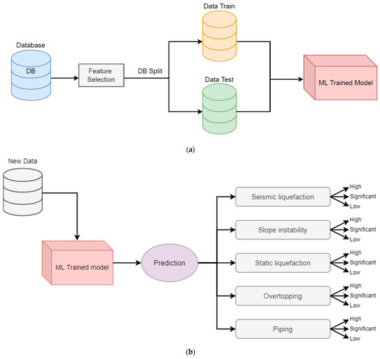 Once the database with its respective labels was created, supervised models were applied to analyze the PS of STD from medium-sized Chilean mining. For this, four models were used, namely RF, SVM, ANN, and XGBoost, according to the scheme shown in Figure 1a. Once the ML algorithms were trained, predictions were made against input data not seen by the models; in this way, the inference of the model was carried out, as shown in Figure 1b. Note that to perform the training and validation of the models, 80% of the total data was used, while 20% was used for the test sets.