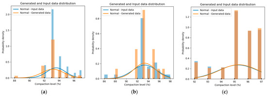 Comparison between the distribution of generated data and input data for the geotechnical critical variable “compaction level (%)”. (a) Distributions corresponding to Experiment 1. A difference can be seen between the probability density of input data versus generated data, mainly due to the small amount of data and the imbalance of the classes used for the generation. (b) Distributions corresponding to Experiment 2; it shows an improvement compared to (a) when considering balanced classes for generation. (c) Distributions corresponding to Experiment 3; a similarity of the probability densities between both data sets is observed due to the increase and balancing of the training samples.