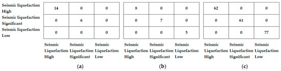 Confusion matrix for the “seismic liquefaction” failure mechanism using the XGBoost model. (a) Confusion matrix corresponding to Experiment 1; an absence of “true positive” can be observed for the “low” class due to the imbalance of the classes and the scarcity of information in the data set. (b) Confusion matrix corresponding to Experiment 2; it shows an improvement compared to (a) when the classes are balanced, and the amount of data is increased by generating using TGAN. (c) Confusion matrix corresponding to Experiment 3; by increasing the database, it is possible to have a better test data set, maintaining the good results obtained in Experiment 2.