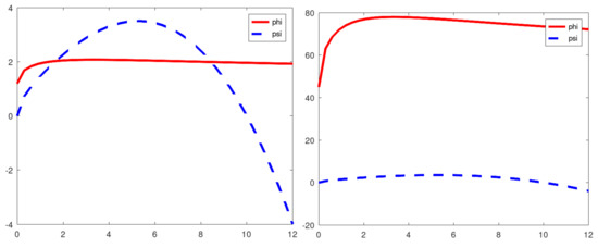 The functions (blue) and (red) in two different possible configurations, showing that their intersections are not always guaranteed to be feasible for the parameters (5). Left frame: ; and Right frame: .
