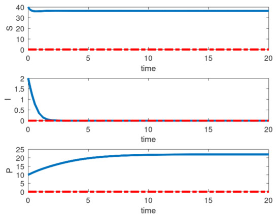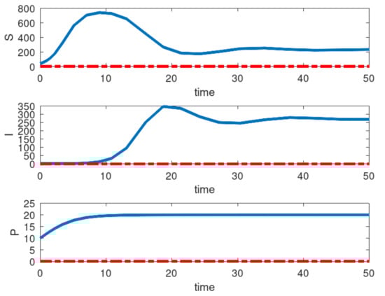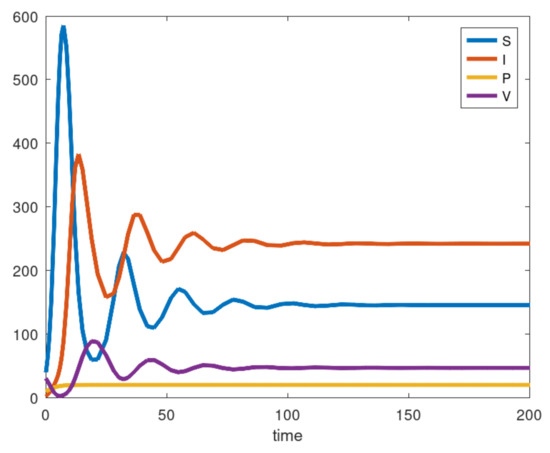 Thus, from this theoretical analysis, the only possible outcomes at steady state are the disease-free environment at or population coexistence with endemic disease at . These points can indeed be achieved, as shown in Figure 2 and Figure 3, using suitable sets of parameters. Specifically, those for are