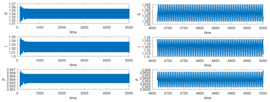 In addition, the numerical exploration of the system behavior shows that persistent oscillations are found, Figure 4. They occur for the following parameter values: