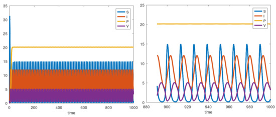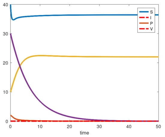 Furthermore, the comparison of the population values in Figure 3 and Figure 6 obtained with the parameter values (23) together with (28) shows that the presence of pathogens in the environment has some influence in this case. The infected are slightly higher in the model with no virus, reaching values slightly above 250. When the virus is present, they attain values around 250. However, the number of susceptible individuals is much higher in the former case, above 200, while they settle to 150 in the presence of free pathogen. Thus, the addition of a viral agent in the environment does not appear to have a great consequence on the ecosystem behavior in these conditions, although it certainly contributes to reducing the number of healthy prey. Predators do not seem to be affected, as they always settle to the carrying capacity.