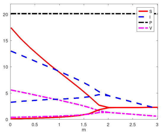 In Figure 8, we show a bifurcation diagram in terms of the parameter m, the prey natural mortality. The Hopf bifurcation arises at the threshold . The other parameters and initial conditions are, respectively, given in (29) and (30).
