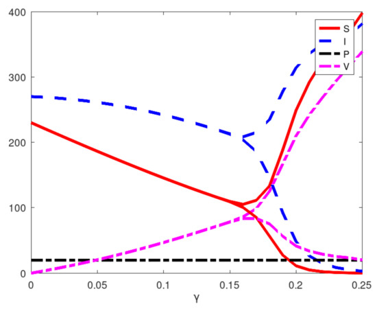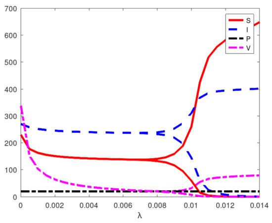 A corresponding effect is noted by changes in the parameter . In this case, however, the decrease in the susceptible prey is more prominent until the oscillation onset, while the same behavior occurs also for the infected. This is surprising because a higher discharge of the pathogen in the environment by the infected individuals reduces the negative effect on the whole prey population. In Figure 10, during this phase, the virus accumulates in the environment with a steady increase. In this situation, the onset of limit cycles occurs above the critical value .
