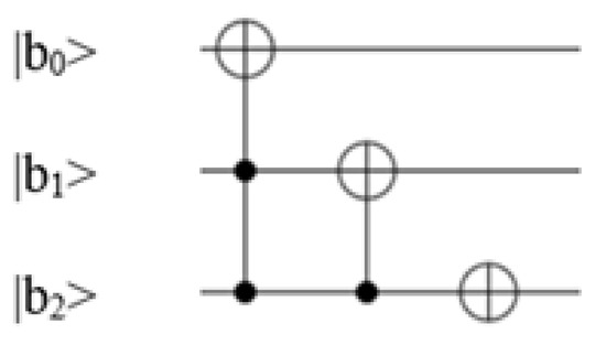 Figure 2 represents a quantum logic circuit that acts on a vector, composed of 3 qubits, performing an increment operation detailed by the AND and exclusive OR operations.