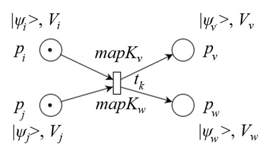 Figure 4 shows a QPN modeling a quantum logic circuit that sequentially applies the mappings (i.e., gate operations) , , to the qubits , and |, respectively, performing the operations .