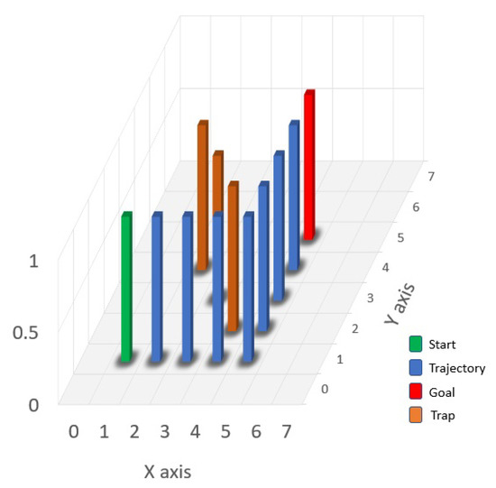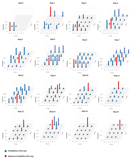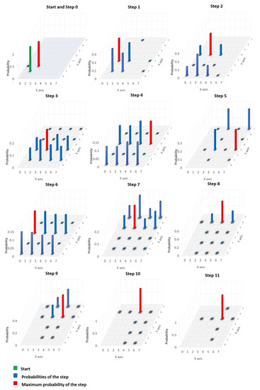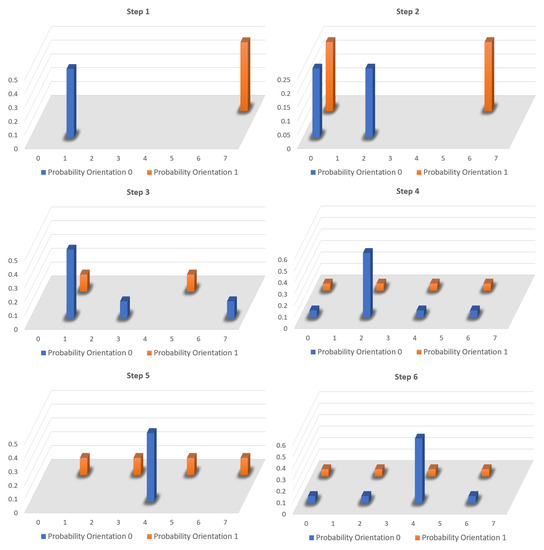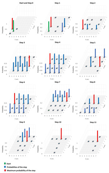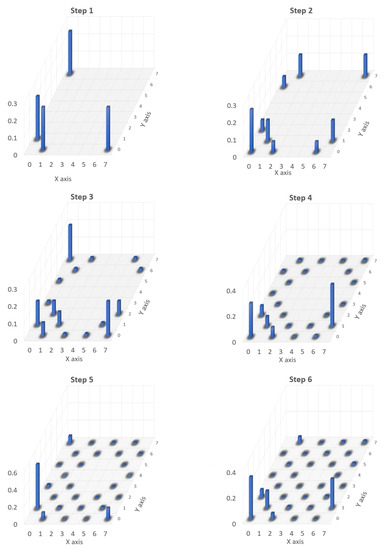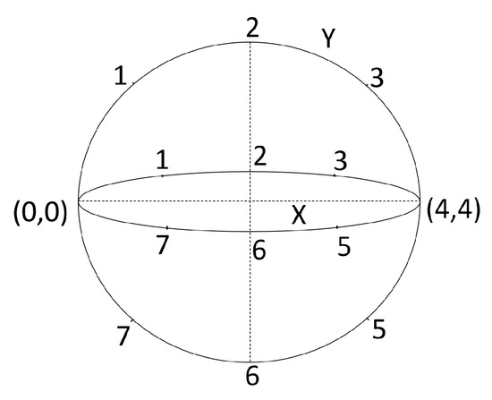 Denoting with the vector provided by at a discrete time , a classic dynamic system can be described by . If U is a unitary matrix, the walker’s position, provided by X, remains in Hilbert space (i.e., on the circle domain).