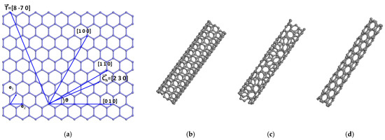where , and (see Figure 2a) are the vectors that describe the hexagonal lattice, of length , with l as the internode distance. n and m are any integer numbers. A nanotube of diameter is obtained by rolling the planar hexagonal sheet along the vector
