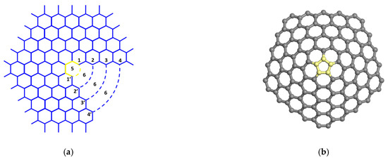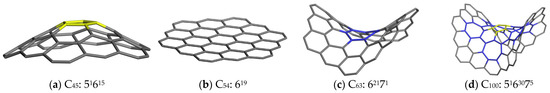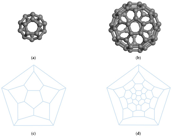 The distinction between two isomers of Cn can be made by their symmetry or by the determinant of the connectivity matrix that describes the topology of the fullerenes [42]. Another tool provided by graph theory is the Schlegel diagrams [43], a method for reducing the representation of fullerene to a two-dimensional graph that describes the connectivity of the nodes on the graph and the arrangement of the rings (see Figure 6c,d).