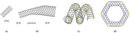 The nanotubes obtained from rolled graphite sheets (see, for example, Figure 5a) are monodimensional systems, but they can be transformed into three-dimensional systems by introducing several non-hexagonal rings. Thus, two nanotubes of different chirality types can be joined by introducing pentagonal and hexagonal rings. In Figure 5b, a hetero-junction between two nanotubes (9,0) and (9,9) is shown; there is a heptagonal ring at the boundary between the (9,0) nanotube and the heterojunction, and a pentagonal ring at the boundary between (9,9) and the heterojunction. When several successive pentagonal rings are inserted into a nanotube, it transforms into a nano-spiral system (see Figure 5c), or into a closed torus (see Figure 5d), when several heptagonal rings are also considered.