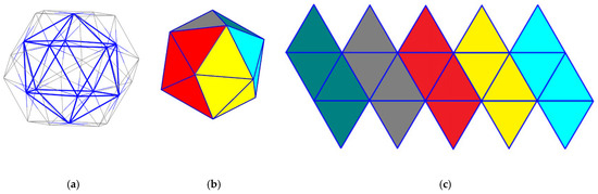 Considering the centers of the pentagonal rings and connecting them, we obtain the dual graph of the dodecahedron, which is the icosahedron, a polyhedron with 20 triangle faces (see Figure 7a) [46]. The vertices of the icosahedron have a degree of 5. After coloring each of the three neighboring faces of an icosahedron with the same color (Figure 7b), the unfolded icosahedron looks like Figure 7c.