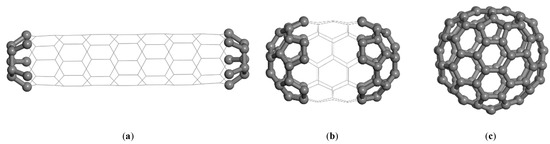 Mathematical chemistry is a subfield of mathematics, which provides the theoretical framework and methodology for the various fields of chemistry [18,19,20,21]. In particular, different fields of mathematical chemistry (chemistry graph theory, algorithms of structure enumeration and generation, molecular static and dynamic methods) were developed, parameterized and applied to the investigation of various structures formed by carbons atoms. At the nanoscale the carbon atoms form two-dimensional lattices, which are characterized by five- and six-member rings, where carbon atoms are connected to another three neighbor carbons atoms by strong covalent bonds. The topologies of these nanosystems are very similar to those of the macroscopic shell structures but have fewer edges per node and implicitly more reduced self-weight.