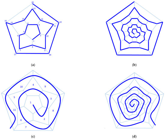 How can the arrangement of the rings be described? The solution is provided by graph theory, which defines the Hamilton path as a path that begins at one face (usually a pentagonal one) and proceeds in a spiral order through each face that is visited exactly once [47,48]. A similar path can be determined by using the vertices as references instead of the faces. When the path ends at the same initial face or vertex, the Hamiltonian path is called the Hamiltonian cycle. In the first row of Figure 10 are presented the Hamiltonian paths for C20 and C60 fullerenes, the smallest fullerenes with the icosahedral symmetry Ih. The numbering of the nodes is along the Hamilton path. Thus, based on the ordering of the types of rings, the different isomers can be distinguished and the unique isomers are identified.
