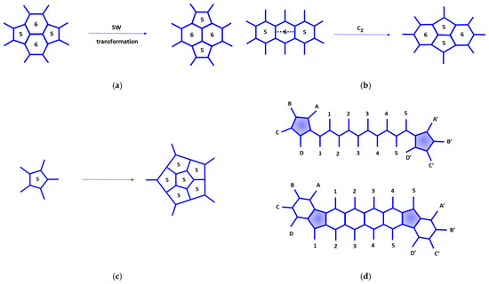 The isomers can be transformed from one to another by the Stone–Wales rearrangements [57], which consist of the rotation of a common edge of two pentagonal rings by 90° (see Figure 11a). Some rings different from five and six-member rings, which are considered defects, are produced for other situations. Larger fullerenes can be constructed from a given fullerene by insertion of a dimer C2 into a hexagonal ring connected to two pentagonal rings (the Endo–Kroto procedure [58], see Figure 11b) or insertion of pentagonal and hexagonal rings (see Figure 11c,d). Thus, the connectivity of the respective rings with the environmental atoms is preserved. Fullerene coalescence [59] is another growth mechanism that can be described at the atomic scale [60].