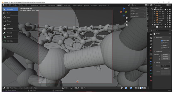 Various computational chemistry software can be used to produce the nanostructures and save the atoms’ coordinates in files of type pdb (Protein Date Base) or xyz (Cartesian coordinates). Such files can be imported into CAD codes as Blender [4] allows, together with the add-ons molblend [79] or atomic [80], the conversion of the nanostructures to a macroscopic object by size rescaling and automatic meshing of the edges of the fullerene- or tube-like objects (see Figure 14). Blender is a free program, oriented towards 3D design, rendering, meshing, sculpting and artistic modeling. It is able to perform some simulations and animations, considering various forces.