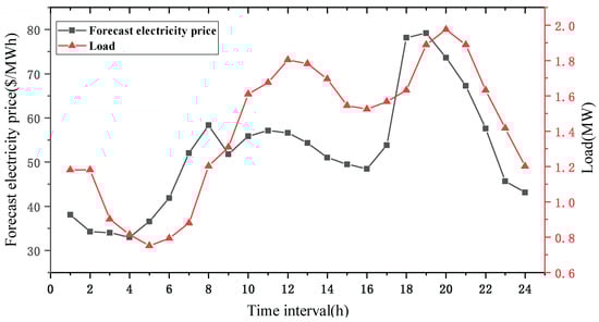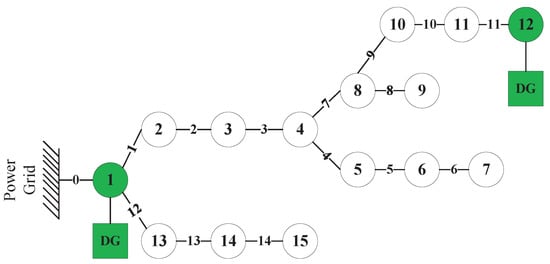 To prove the validity of the proposed model, a modified 15-node distribution network system is selected for numerical study in this paper and the structure of the distribution network system is shown in Figure 2 (the specific parameters are in [45]). Two DGs are set at nodes 1 and 12, respectively. The capacity of each DG is set to 0.15 MW and their power generation cost is USD . The forecast spot price and distribution system load are shown in Figure 3. Suppose that the peak period of electricity consumption is and the rest of the period is non-peak period. The call option strike price USD and the option premium USD . In addition, set the weighting factor in the credibility function.