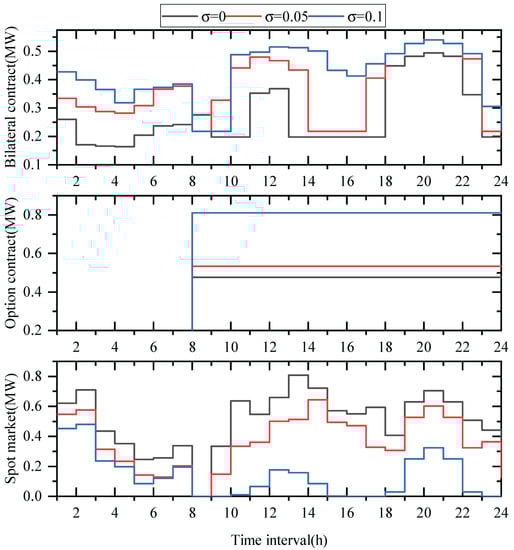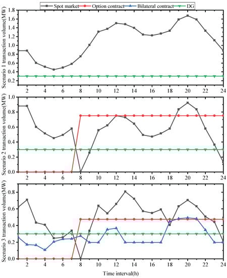 First of all, it is assumed that the actual spot price equals the predicted value. The minimum cost of DSO is obtained by solving the deterministic electricity transaction model. The optimal DSO electricity transactions in different scenarios are shown in Figure 4. In scenario 1, DG output is 7.20 WMh, the spot market purchase is 26.48 MWh and the cost of DSO is USD 1684.0. In scenario 2, DG output is 7.20 WMh, the spot market and option contract purchase are 13.70 MWh and 12.78 MWh, respectively, and the cost of DSO is USD 1682.5. In scenario 3, the option contract purchase is 8.09 MWh, the bilateral contract purchase is 6.42 MWh, the DG output is 7.20 MWh, the spot market purchase is 11.96 MWh and the cost of DSO is USD 1655.6. It can be seen that with the increase of transaction form, the electricity purchase cost of DSO gradually decreases.
