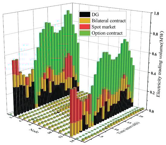 For scenario 3, DSO’s DG output and electricity transaction in spot market, bilateral contract and option contract are shown in Figure 5. As can be seen from the figure, the non-peak period electricity transaction market is mainly in the spot market and bilateral contract and peak period electricity transaction market is mainly in the spot market and option contract. Overall, DG output, bilateral contract, spot market and option contract accounted for 21.4%, 19.1%, 35.5% and 24.0% of the total electricity consumption, respectively. The bilateral contract trading volume of each node is shown in Table 3.We can see that bilateral contract transaction is mainly in nodes 2 and 13. Nodes 2 and 13 choose contracts 3, 4, 5, 7, 8, 9, 10 to trade electricity. This is because these two nodes have a high load demand and multiple bilateral contracts can be selected to meet their own demand. The other nodes with low load demand only choose a bilateral contract to trade electricity during peak and non-peak periods. In addition, since the load demand of node 14 is too small, there is no suitable bilateral contract for it to choose, so it meets its own demand through the spot market and option contract.
