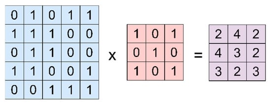 YOLOv4 is an algorithm based on convolutional neural network, and convolutional neural network is composed of convolutional layer, pooling layer, and fully connected layer. The convolution calculation consists of four parts: the input data size, the filter (Kernel map) size, stride, and the output data size, among which the filter and stride will directly affect the result of the convolution operation. Convolutional layer obtains the local features of the audio signal by sliding up and down a window with a customizable size in sequence, and then generates a feature map through the activation function as the input of the next layer, as shown in Figure 6. As can be seen in Figure 6, the blue box is the input, the red box is the 3 × 3 kernel map, and the purple box is the result, assuming that stride is set to 1 × 1; that is, the red box will be in the blue box according to 1 × 1 to moving, and if the number in the red box is the same as the number in the blue box, it is multiplied. When the first step is completed, the result in the purple box is 4, and other results can be obtained according to the same steps to obtain the complete result of the purple box.