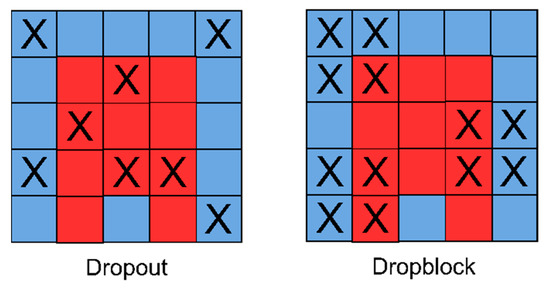 Dropblock is used to replace Dropout. The traditional Dropout is shown on the left side of Figure 8. It can be seen that Dropout will randomly prevent neurons from participating in this iterative training to prevent overfitting. Overfitting means that the neural network learns the features too thoroughly, whether they are correct or wrong data, which contains noise and which leads to the high learning accuracy of the neural network, but the generalization and identification accuracy are very low. Because the convolution layer is not sensitive to the way of random discarding, this is because the convolution layer is usually used at the same time with the pooled and fully connected layers. Even if the convolution layer is discarded randomly, the convolution layer can still learn the same information from the adjacent activation units, and the benefit is not high. Therefore, Dropblock is used in YOLOv4, which will be discarded together with adjacent neurons according to the discarded neurons, as shown on the right side of Figure 8.