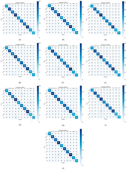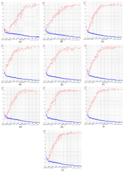 Figure 9J shows the mAP curve and the average loss curve of the ninth experimental results, where the mAP value is 92.4%, the average loss rate is 0.2485, and the number of Epochs is 20,000. Figure 10J shows the confusion matrix using the ninth experiment weights on the test set, and the Precision is 0.95, the Recall is 0.95, the F1-score is 0.95, the Accuracy is 0.935, and the mAP result using the test set is 98.19%. It can be seen from Figure 9J that the results of the tenth experiment are close to the results of the second experiment, but the difference from the second experiment is that the mAP value of the tenth experiment is steeper when rising. The average loss rate was half that of the second experiment, coming to 0.2485.